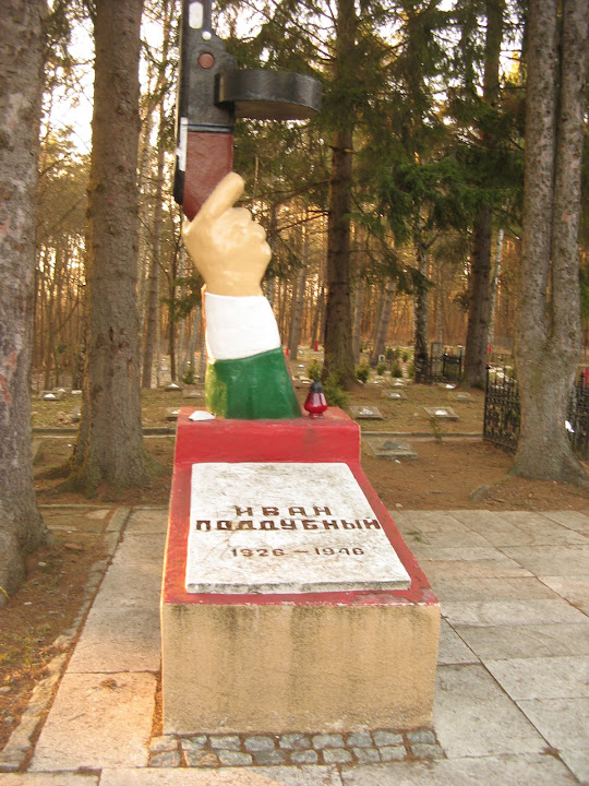 Pomnik znajduje sie w parku, wokol chyba sa rozne groby. Co ciekawe sierp z mlotem przytwierdzony do pomnika zdaja sie byc prawdziwymy narzedziami. Wspinam sie na pomnik- sierp jest tepy..