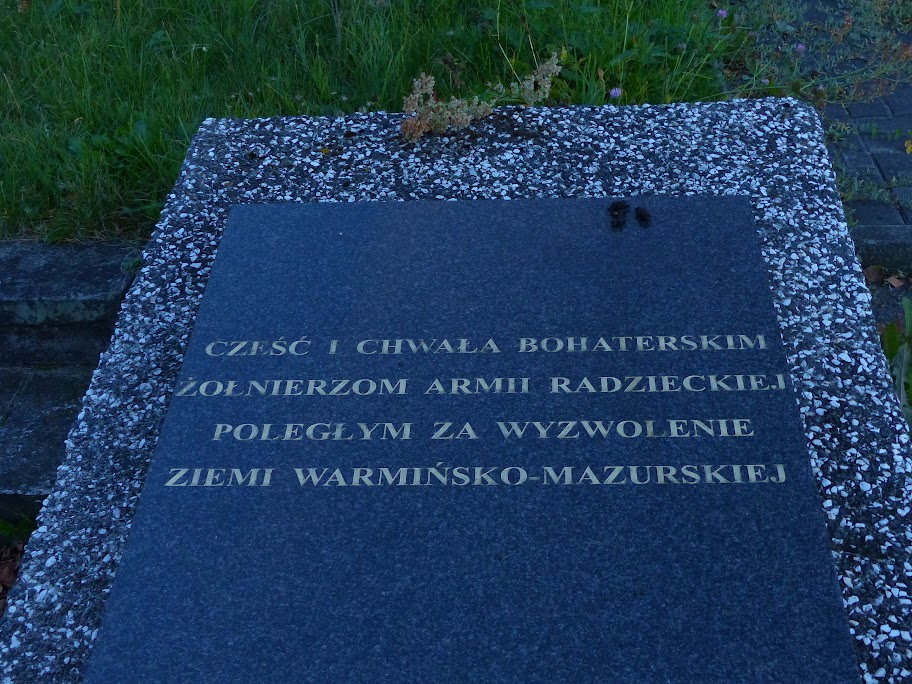 Rzuca nam sie w oczy cmentarzyk radziecki. O dziwo jest odnowiony, ognista czerwień az bije po oczach. Leżą swieze kwiaty. Ktos wyraznie pilnuje tego miejsca i o nie dba. Obchodze cały teren z nadzieją na jakis ciekawy pomnik. Niestety sa tylko rzędy identycznych nagrobków i pamiątkowe tablice.