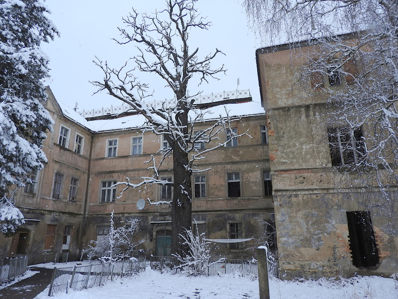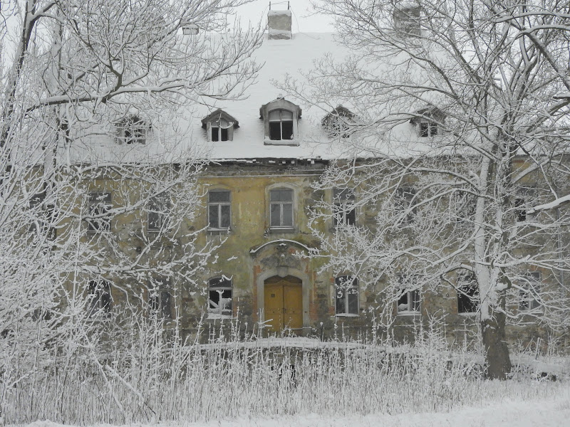 Dzis nawalilo sniegu jeszcze wiecej.. Niech to jasny szlag.. Za oknem landszafcik jak na pocztowkach bożonarodzeniowych… Zbieramy sie i jedziemy zwiedzac skoro juz tu jestesmy.. moze cos bedzie widac spod tego bialego g… Pierwsza dzis jest Łomnica. Tutajszy palac jest czesciowo zamieszkany, ale co ciekawe, nie tak jak np. w Wiśniowej- pol zamieszkane a pol opuszczone. Tu wystepuje to w sposob przeplatany. Obok zamieszkalych mieszkan ktore znacza firany w oknach, antety satelitarne czy sznurki na bielizne, stoja wypatroszone puste pokoje w ktorych zalega snieg..