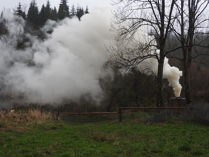 Zawijamy jeszcze dzis na Łopienke. W dolinie sa obecnie dwa wypaly. Zaczyna padac, dymy sie snuja nisko i pomieszane z deszczem pachna jakby intensywniej.