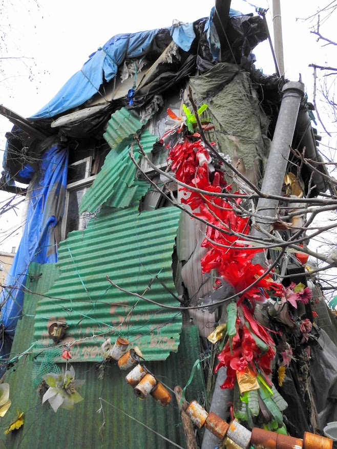Chatka zaczęła powstawać jakieś 15 lat temu. Od tego czasu ciągle jest podprawiana, udoskonalana i oczywiście ozdabiana nowymi kiściami kolorowych bibelotów.
