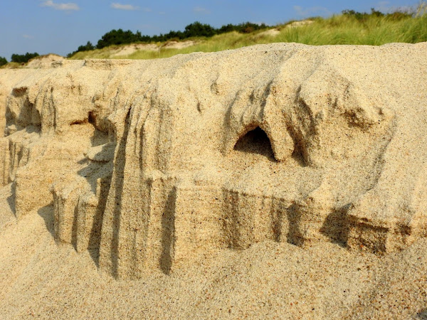 Idziemy kawałek brzegiem w kierunku Dąbkowic. Ciekawe klify się tu utworzyły - mają jakiś metr wysokości, no góra półtora. Jak mrowiska jakiś termitów! Albo najbardziej misternie zbudowane plażowe zamki z piasku! Powstały z piachu ułożonego tak przez wiatr i bijące fale. Jakie toto ma fajne wyrzeźbione, postrzępione, pożłobione formy! Normalnie skalne miasta i kaniony dla krasnali!